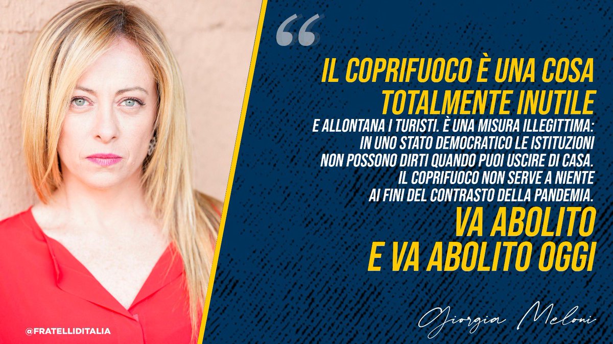Giorgia Meloni ن On Twitter Il Coprifuoco Non Ha Alcun Senso Danneggia L Economia Il Turismo E Non Serve A Sconfiggere Il Virus Va Abolito Immediatamente Non C E Piu Tempo Da Perdere